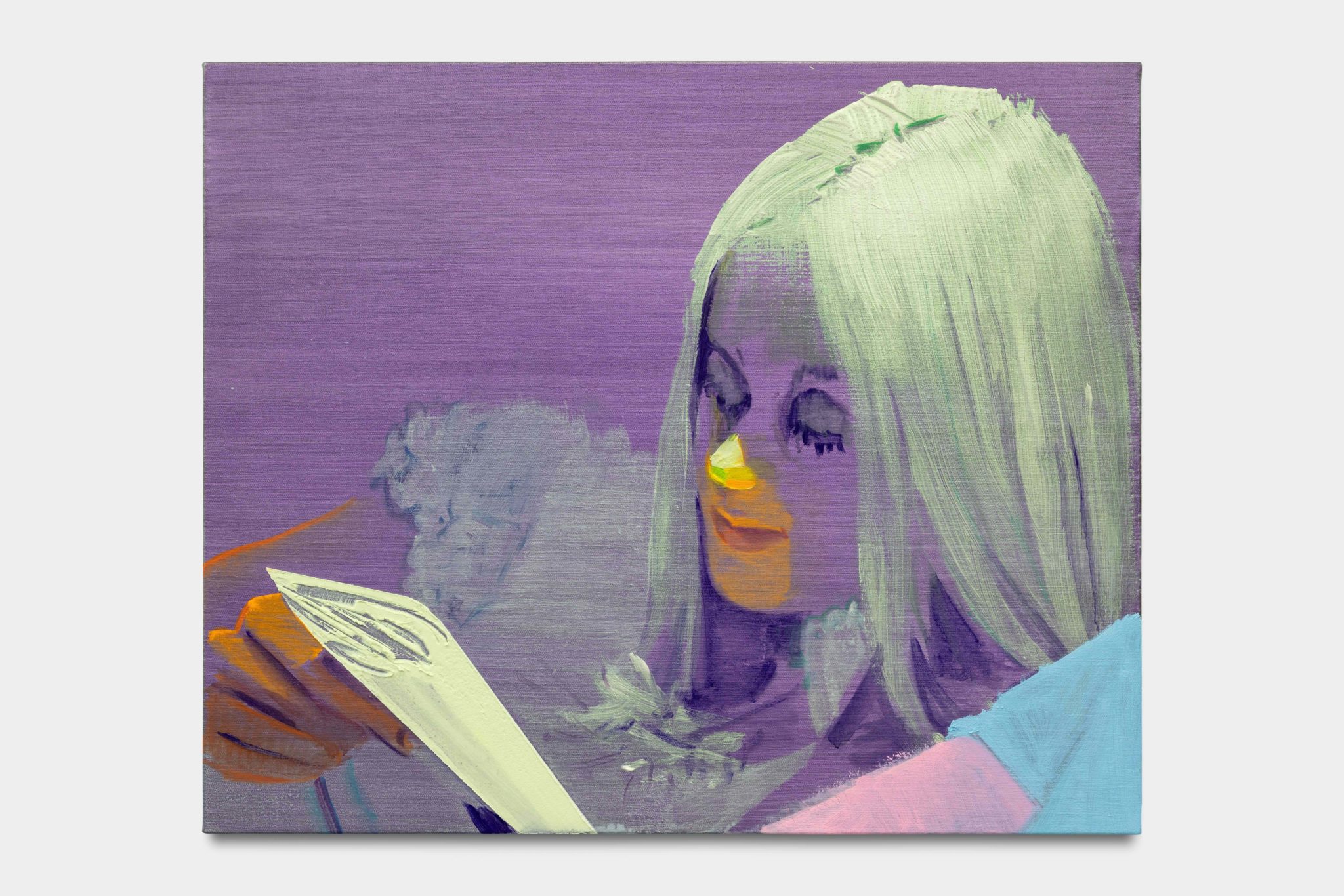 Passionate about cinema and its icons, the artist has created a series of paintings entitled Casting. Continuing her technical research, Nina Childress uses iridescent pigments and Colorstream to create scenes and portraits in motion that question the nature of the gaze and the position of the viewer. The viewer becomes an actor in their perception of the image, with colours subtly varying as they move in front of the canvas. Cinematic framing, off-screen effects and striking expressions evoke the world of the big screen.