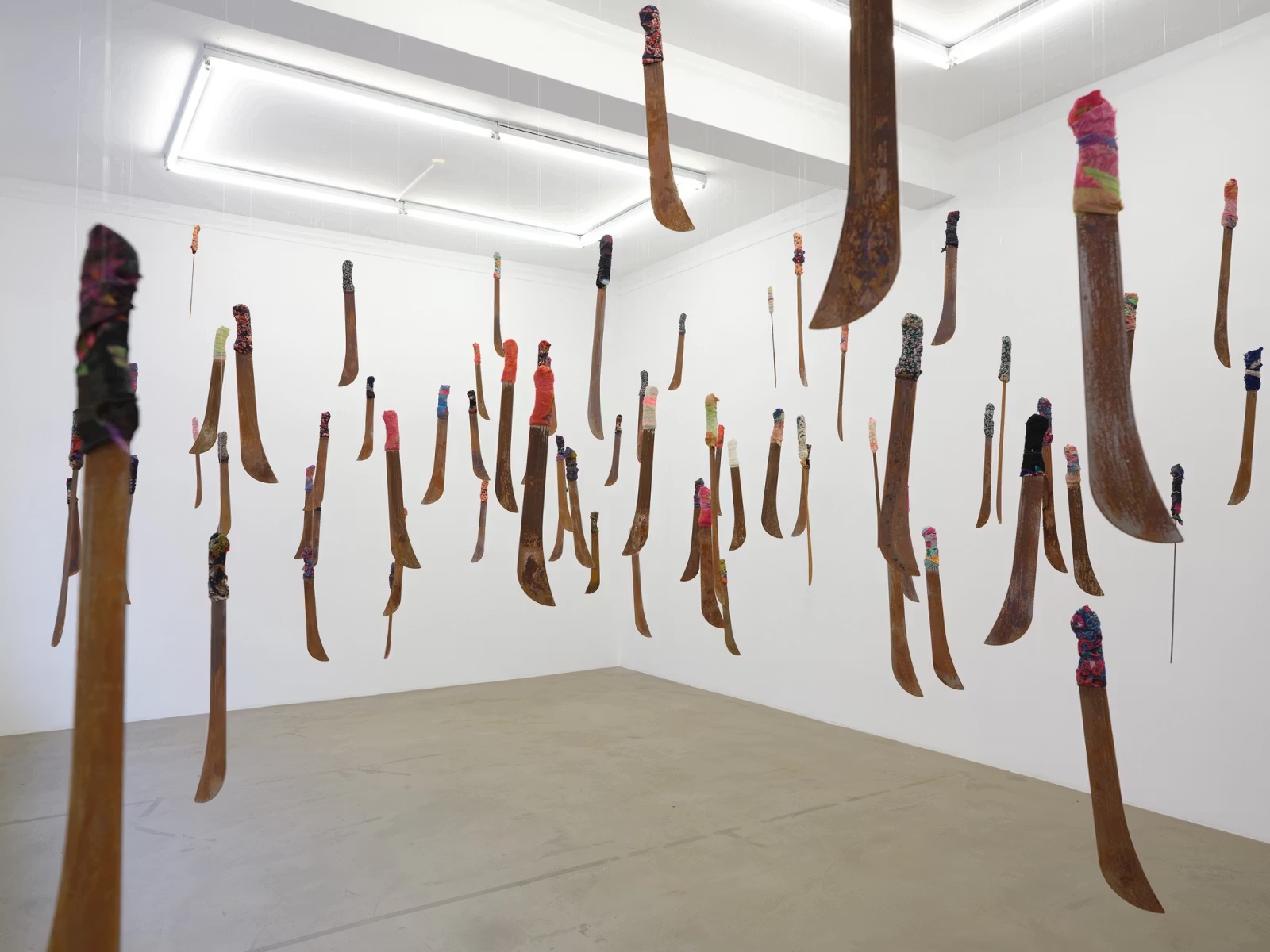 At the centre of the exhibition is Palavras deste tempo sempre novo, an installation of hundreds of machetes suspended from the ceiling – a work Uambembe has developed over the past few years, now presented in its most ambitious scale. The installation’s title – which translates as Words of this ever new time – also draws from Meninos do Huambo. In Angola, as in Pomfret, the machete is an everyday tool: domestic, not inherently violent. It is the hand that wields it that determines its power. On the Angolan flag, the machete replaces the sickle – a revolutionary emblem intertwined with histories of labour and resistance. Uambembe wraps each handle in found cloth, softening its grip and personalising its form, transforming the symbol of survival and violence into one of memory and tenderness.