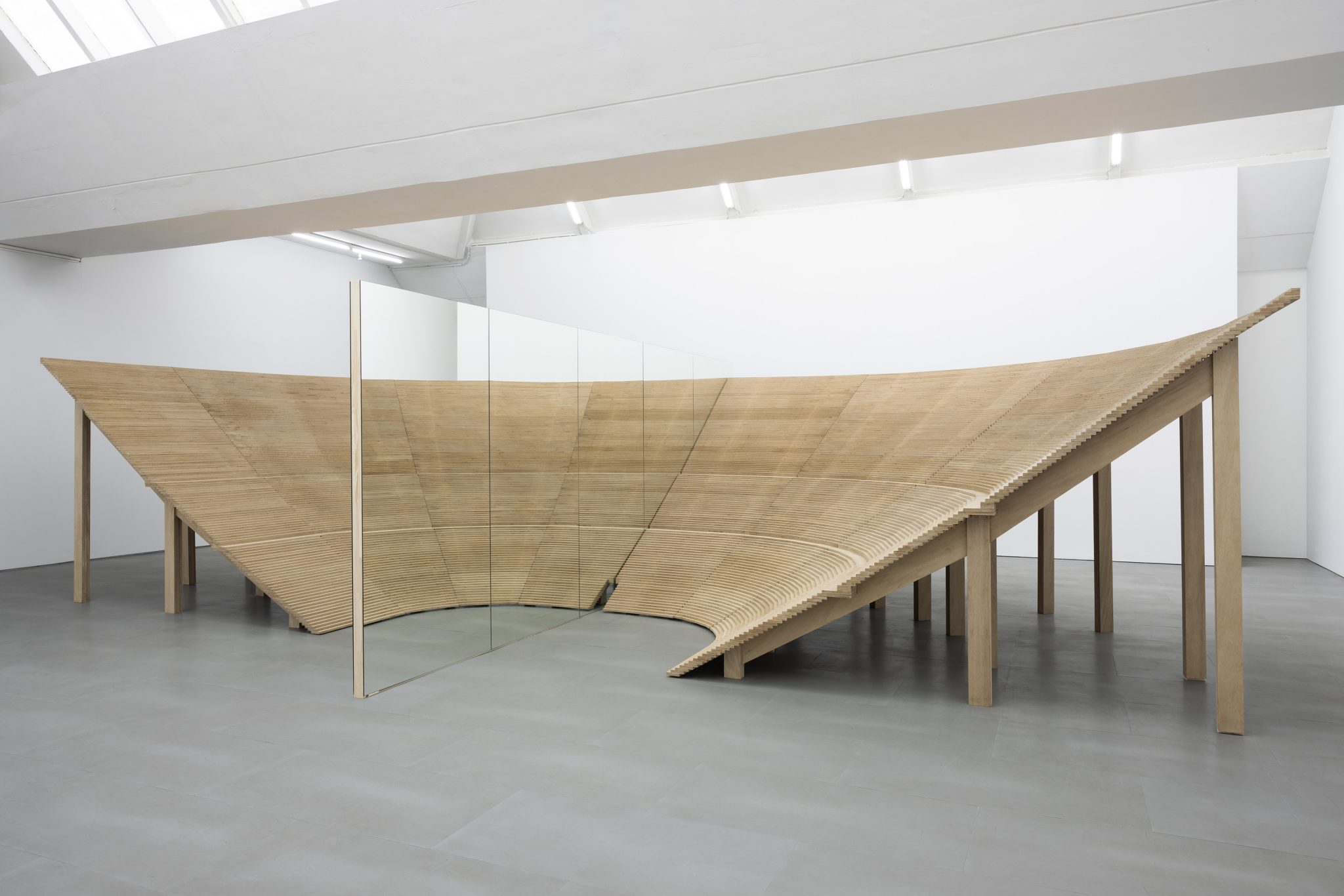 The to this date final Vitruvian Figure from 2015 is carried out in plywood and forms a half-circle divided by a mirror. The two meters high sculpture is based on the Philippine Arena, world’s largest indoor arena located outside of Manila. This colossal building was built in 2014 by religious organization Iglesia ni Cristo, a Christian church founded in the Philippines in 1914. In the wake of anti-colonial movements, it offered an opposition to the Catholicism imposed by the Spanish colonial rule. Today the arena continues to host the congregations of Iglesia ni Cristo as well as sport events and music concerts.